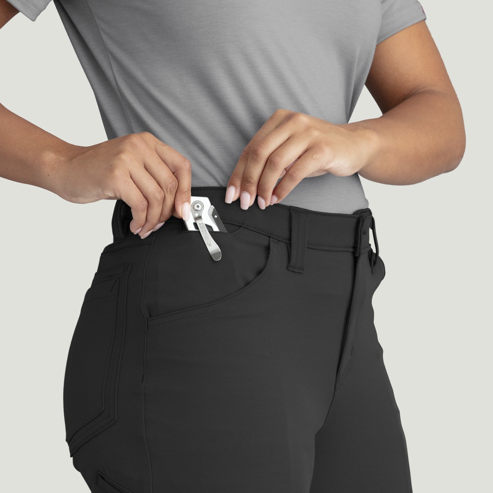 • Cell phone pocket on right leg and hidden zipper pocket on left leg.
